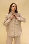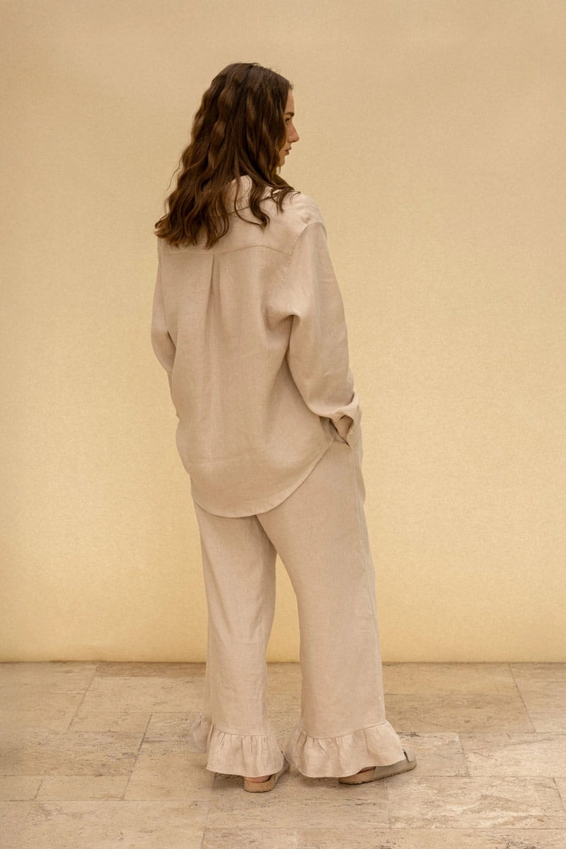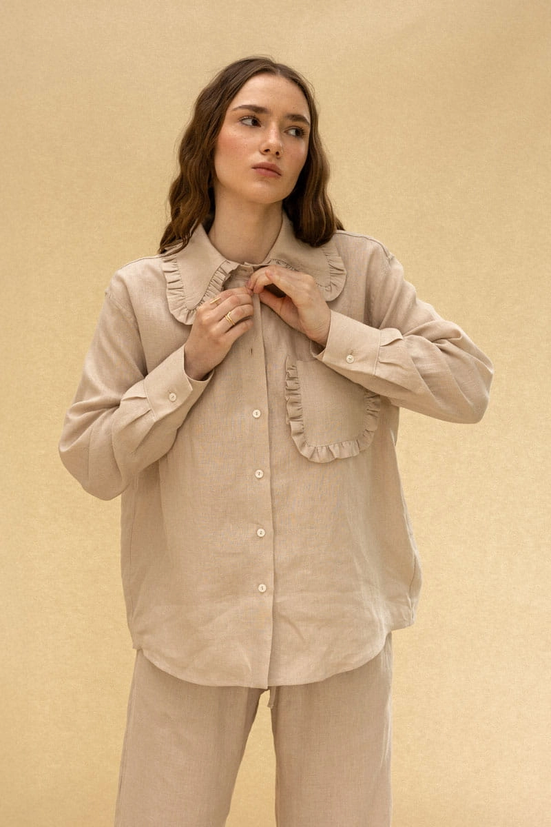 lniana koszula z kołnierzykiem z falbanką, beżowa