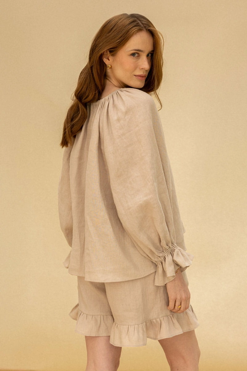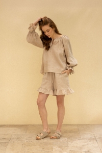 Szorty o swobodnym kroju z falbanką przy nogawkach. W pasie szeroka gumka i lniany sznurek z tej samej tkaniny.