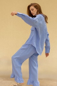 Zaprojektowaliśmy je z myślą o wygodzie na co dzień i podczas snu. Naturalna, zmiękczana tkanina lniana jest przewiewna i miła dla skóry. Spodnie tworzą komplet z niebieską koszulą z tej samej kolekcji.