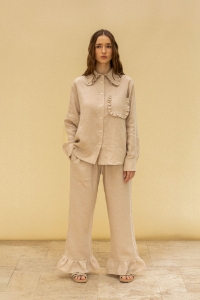 Swobodny krój, lekko rozszerzana nogawka i falbana przy kostce. W pasie szeroka gumka i lniany sznurek z tej samej tkaniny.