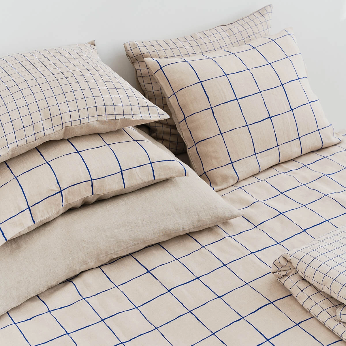 lniana pościel wykonana z 100% europejskiego, spieranego lnu. Piękny naturalny kolor ozdobiony nowoczesnym, prostym i minimalistycznym wzorem kraty.