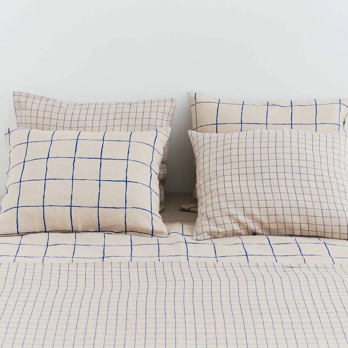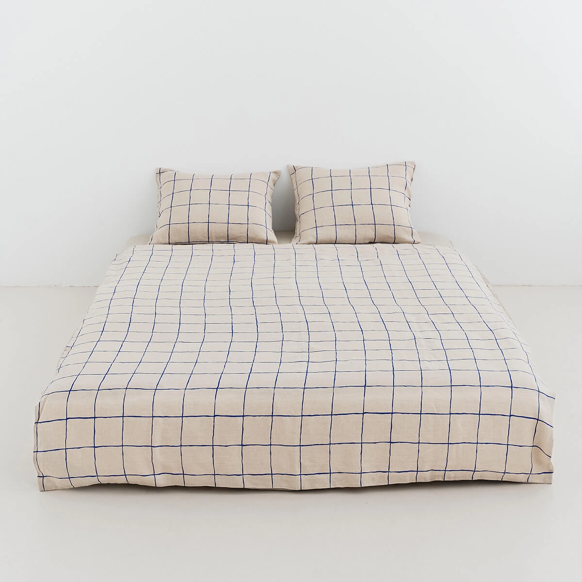 lniana pościel GRID natural blue, w dużą kratę, komplet