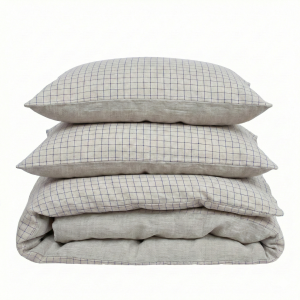 lniana pościel wykonana z 100% europejskiego, spieranego lnu. Piękny naturalny kolor ozdobiony nowoczesnym, prostym i minimalistycznym wzorem małej granatowej kraty. Nasze wzory są autorskie.