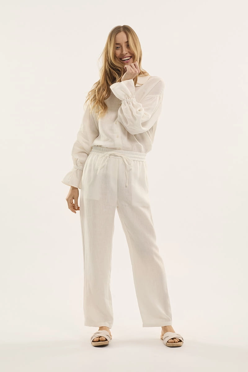 Damskie spodnie lniane w kolorze kremowo białym to najlepszy wybór dla osób ceniących wygodę, piękno i naturalność. Zarówno długie spodnie, jak i lniane szorty białe są idealnie skrojone i nie krępują ruchów. Można je śmiało ubrać na spacer, wakacyjny wypad z rodziną na plażę, a nawet do pracy.. Wszystkie lniane tekstylia, w tym lniane piżamy Moana, delikatnie otulają, zapewniając maksymalny komfort, dzięki czemu można całkowicie oddać się w ręce Morfeusza i wkroczyć w świat sennych fantazji. Spodnie mają dwie kieszenie, co znacznie podnosi ich funkcjonalność. W pasie została wszyta szeroka gumka z dodatkowym sznureczkiem do regulacji, dzięki czemu prezentowany model idealnie nadaje się do różnych figur. W prezentowanej kolekcji dostępne są również lniana koszula biała oraz lniany top biały