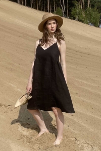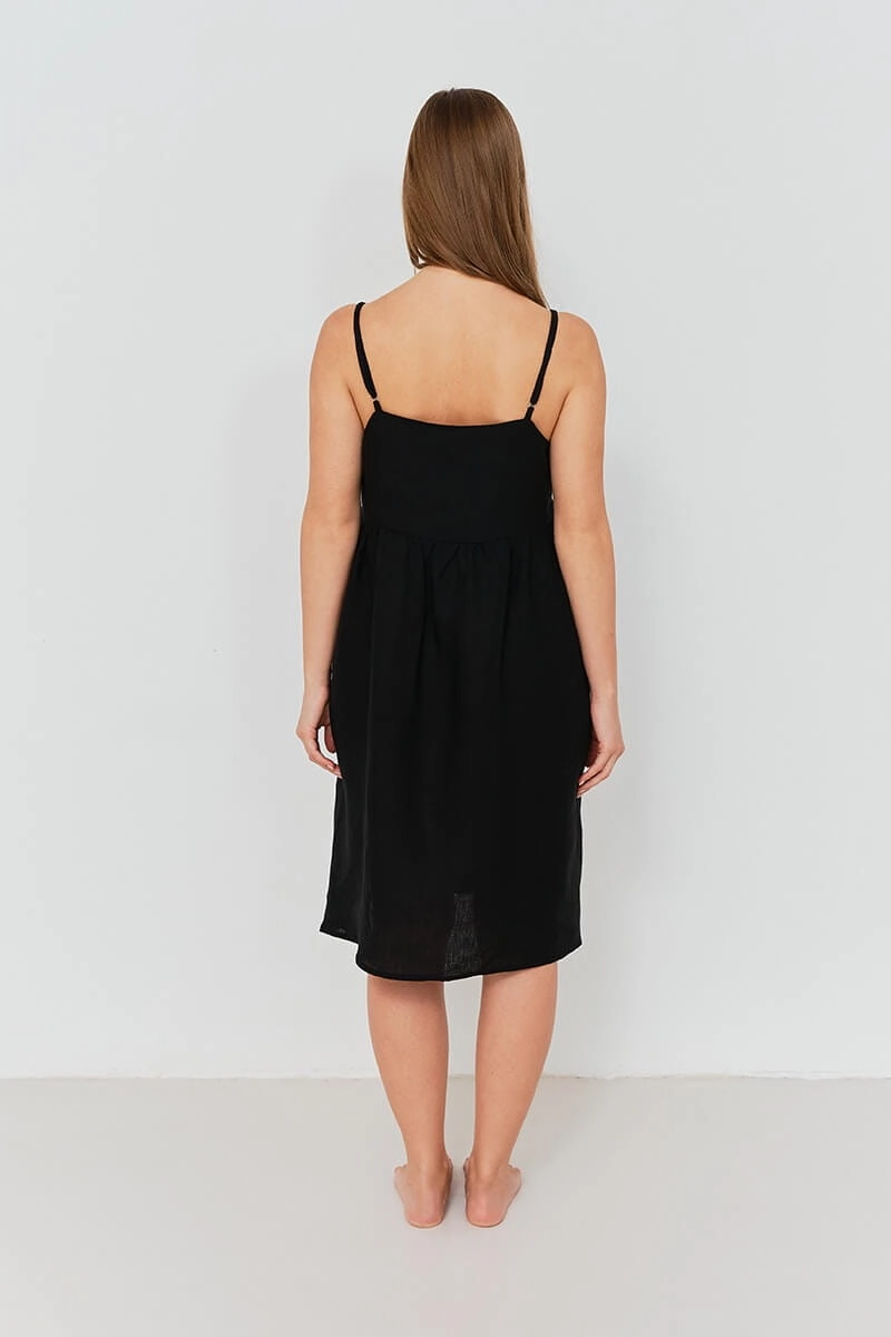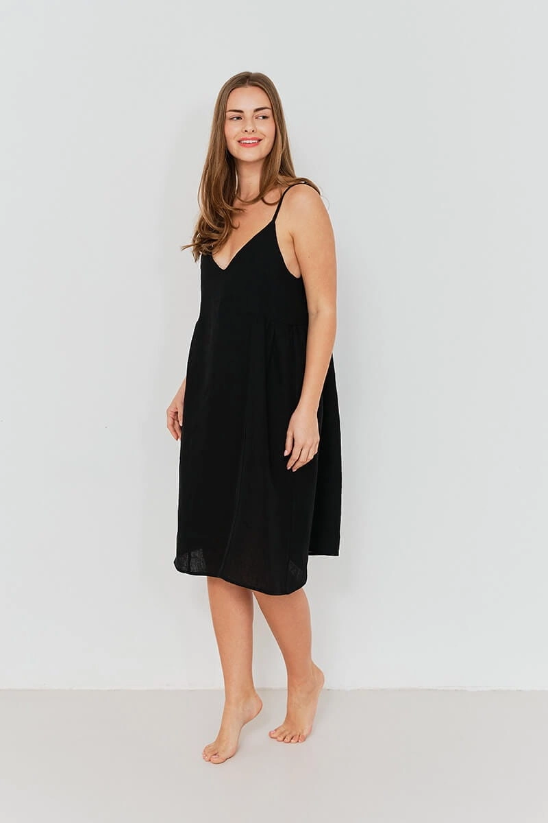 Dodaj odrobinę luksusu do swojej garderoby nocnej dzięki naszej lnianej koszuli nocnej w kolorze czarnymi. Ta koszula nocna to synonim komfortu i stylu stworzona z myślą o kobietach, które pragną czuć się wyjątkowo każdej nocy. Sukienka jest zaprojektowana tak abyś mogła w niej czuć się dobrze również w dzień. Sukienka uszyta jest tak, aby zapewnić komfort ruchu, ma drobne marszczenie pod biustem i dzięki temu nie krępuje ruchów.