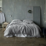 Dobierz do kompletu białe prześcieradło lniane oraz jasnoszarą poduszkę. Możesz też przełamać szarą pościel poduszką w kolorze różowym i różowym prześcieradłem z lnu, nadając swojej sypialni bardziej kobiecego, romantycznego charakteru.